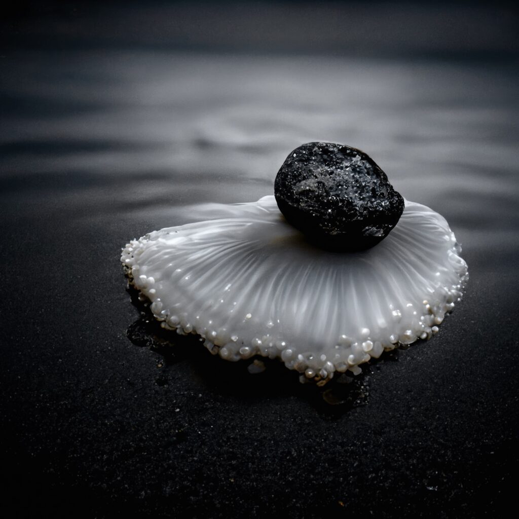 The hybrid creature on the verge of life is a relic from the past, from an exhibition called ‘event horizon’ that I had at the Man and Living World Museum in Israel. After Oct 7 I returned to those ideas, of life awakening, of hybridity and evolution, to find a way back to living a full life. The black rock was added, it is an addition I carry around now.